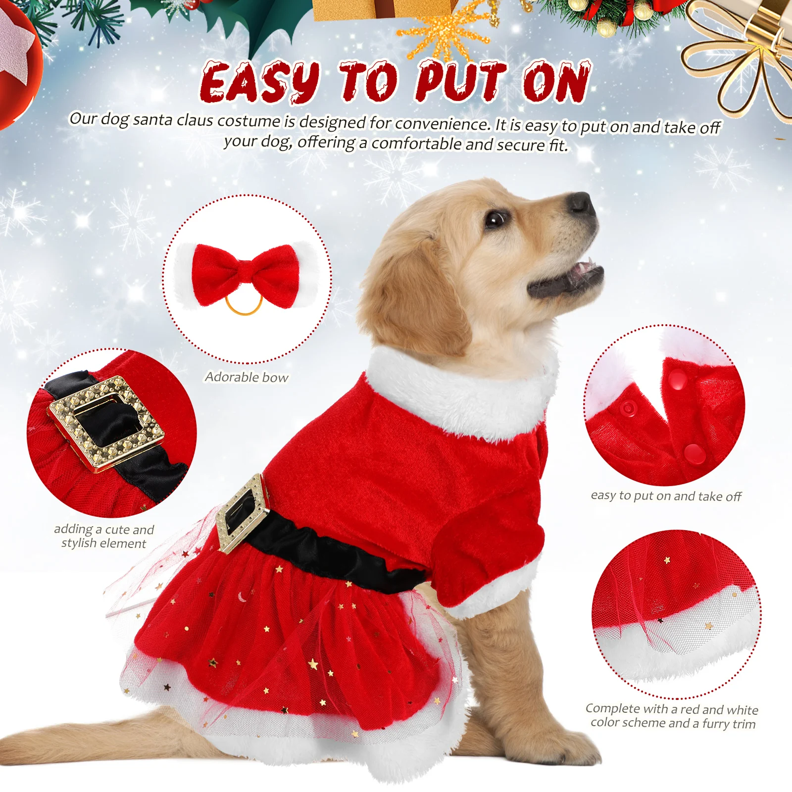 - Easy to put on: Our dog santa claus costume is designed for convenience. It is easy to put on and take off your dog, offering a comfortable and secure fit