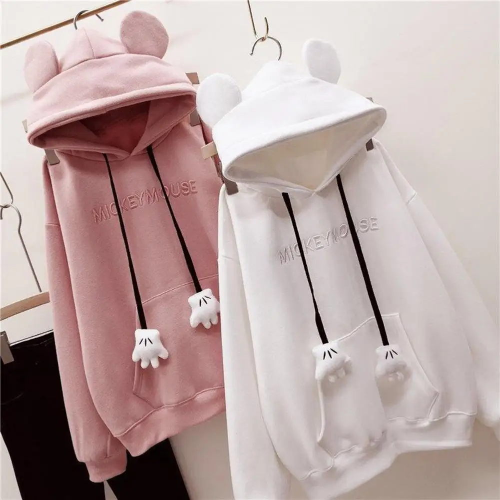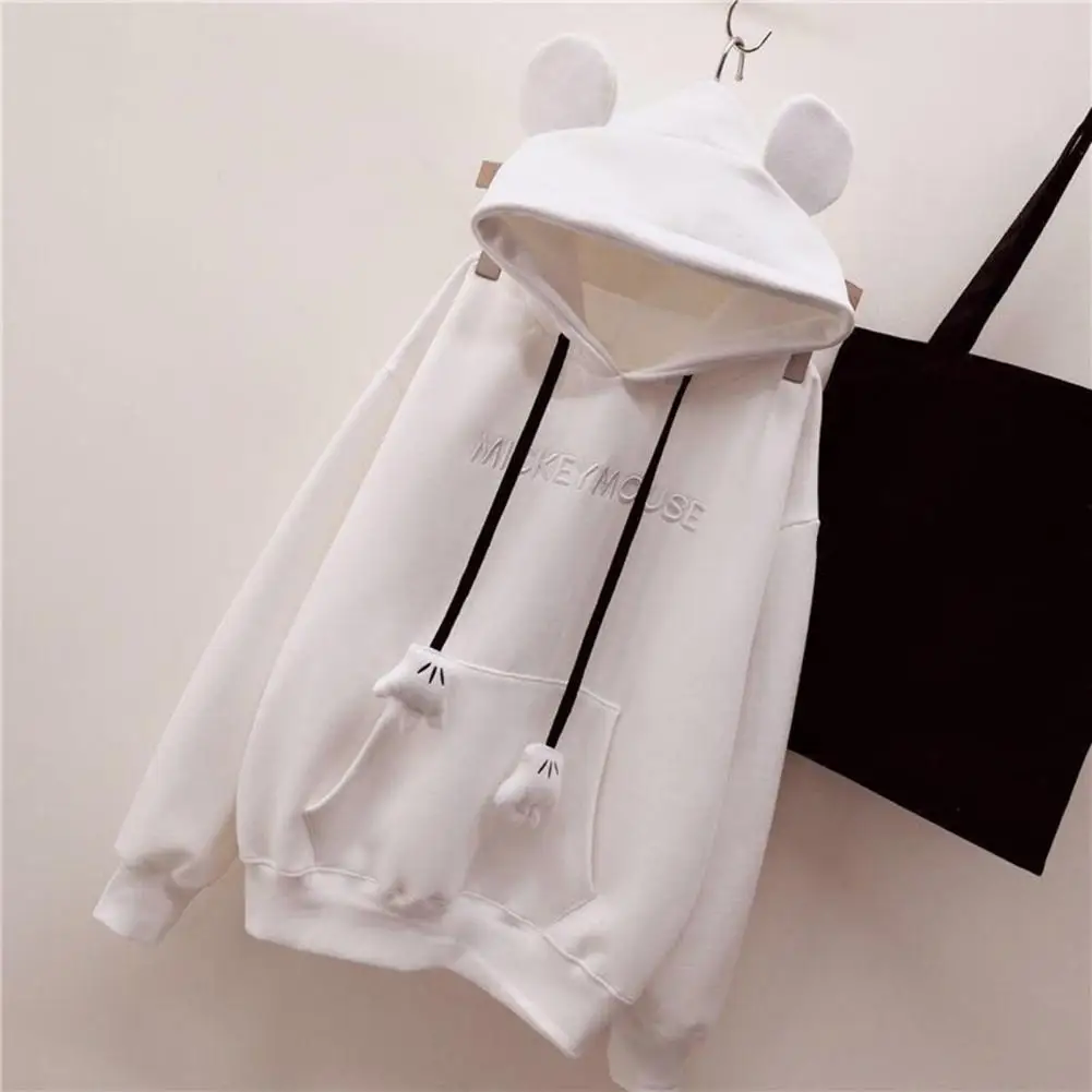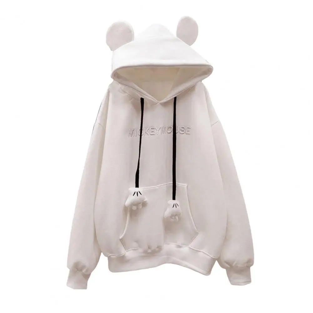 Fall Winter Women Hoodie Cartoon Hand Drawstring Ear Decor Thick Patch Pocket Loose Long Sleeves Pullover Warm Letter Embroidery Top