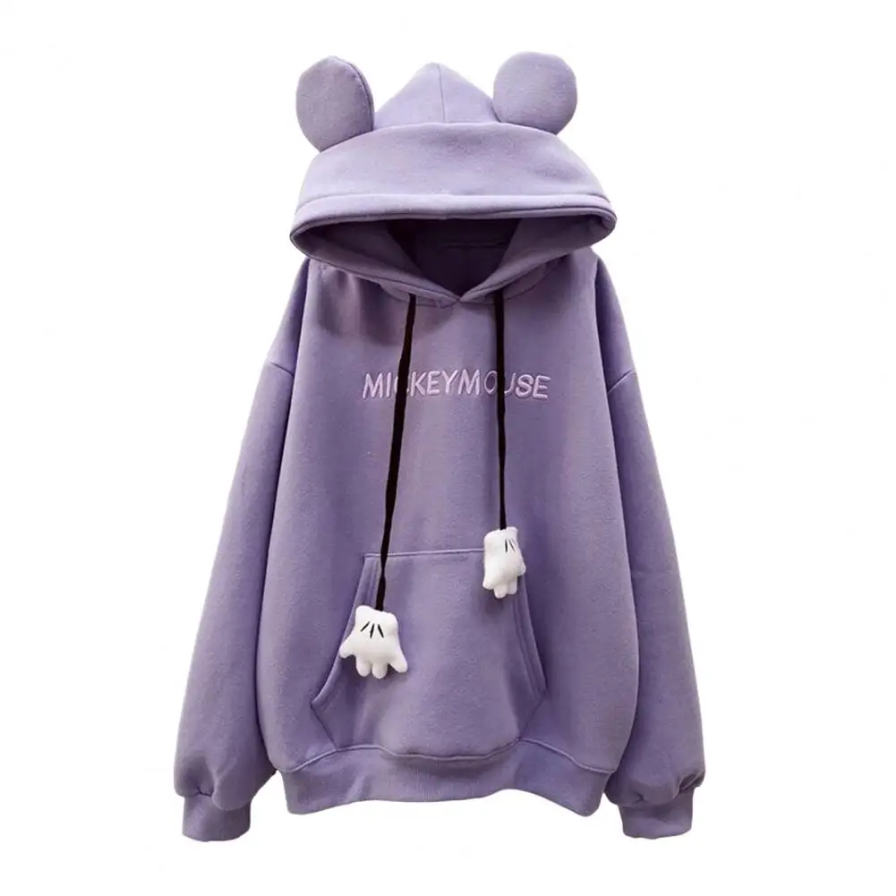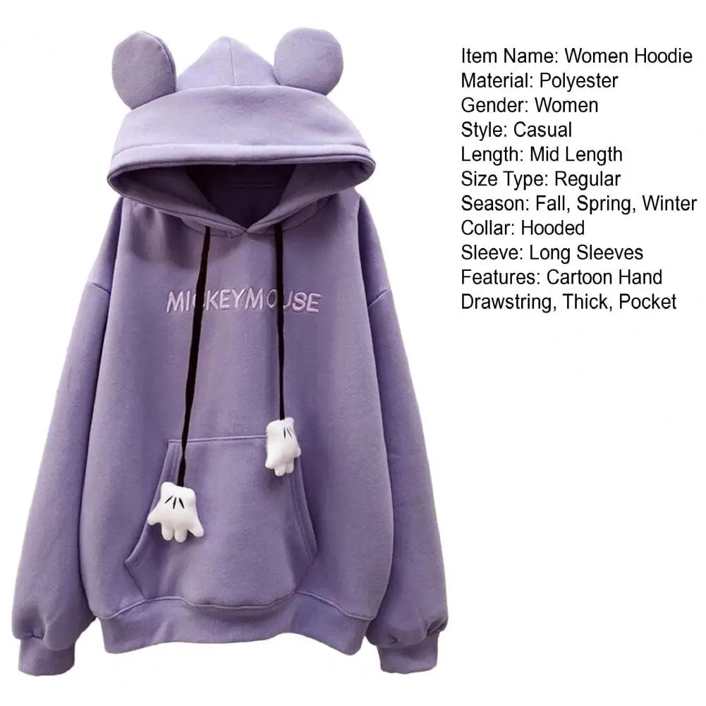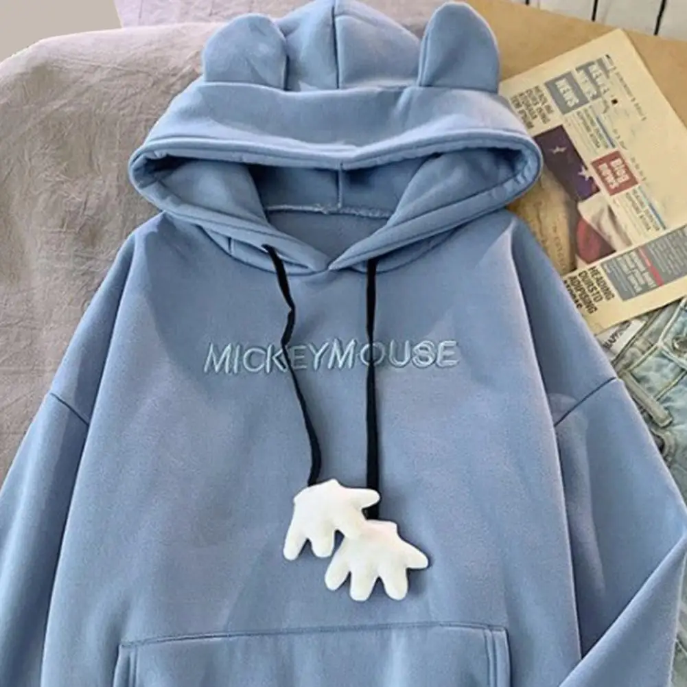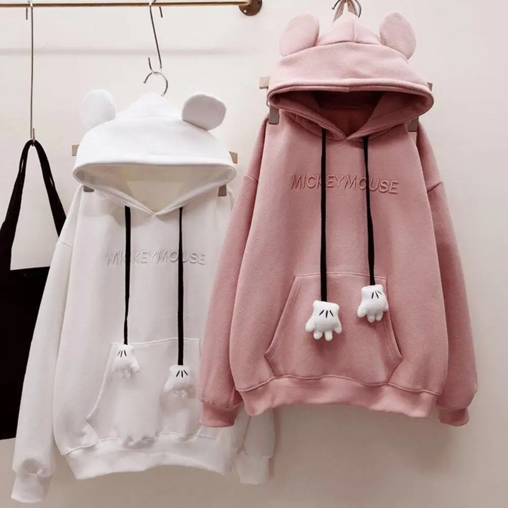 Fall Winter Women Hoodie Cartoon Hand Drawstring Ear Decor Thick Patch Pocket Loose Long Sleeves Pullover Warm Letter Embroidery Top